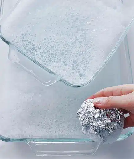 On commence par nettoyer un peu avec de l’eau savonneuse. Dans un récipient recouvert d’aluminium à l’intérieur, versez une solution faite avec 1 cuillère à soupe (15 g) pour 1 litre d’eau de contenance du plat. Laissez poser 5 min avant de récupérer l’argenterie sans vous brûler et rincez.