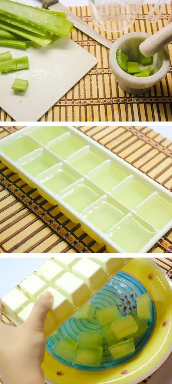 1) Préparez des cubes d’aloe vera congelés pour soulager la peau après avoir été au soleil. Un vrai bonheur à appliquer sur le corps, surtout sur un coup de soleil ou un peau qui tire !