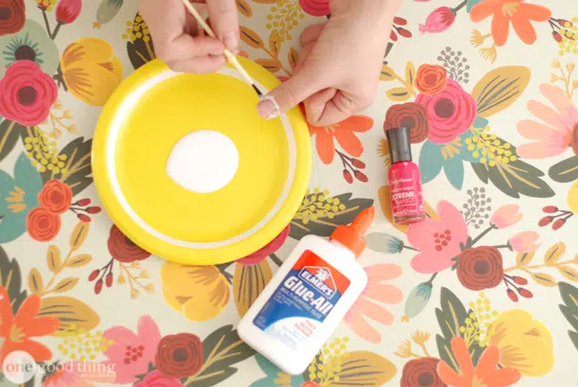 3) Appliquez de la colle blanche autour de l’ongle avant de mettre le vernis. Quand la manucure sera finie, retirez la pellicule de colle et les bavures.