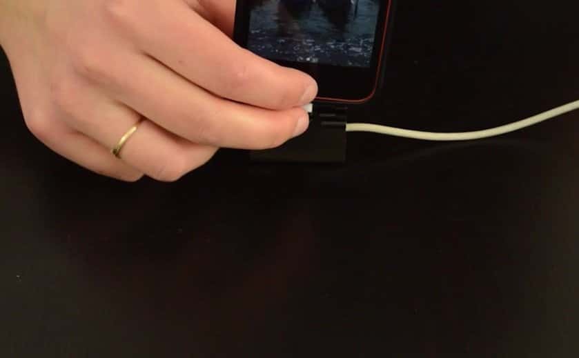 2) Pincez le fil de chargement du téléphone avec la petite pince, retirez la partie métallique et recommencez de même avec votre grosse pince. Vous obtenez un socle pratique pour charger le téléphone.