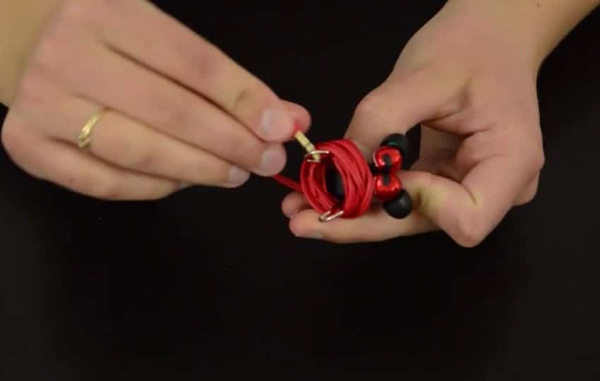 Pincez l’extrémité des écouteurs et enroulez le fil autour. Finissez en coinçant la prise jack dans les parties métalliques de la pince.