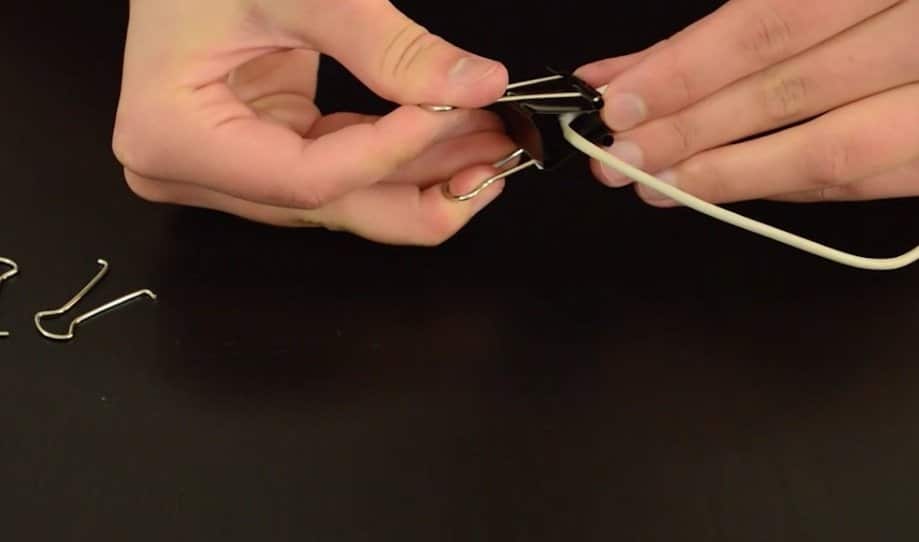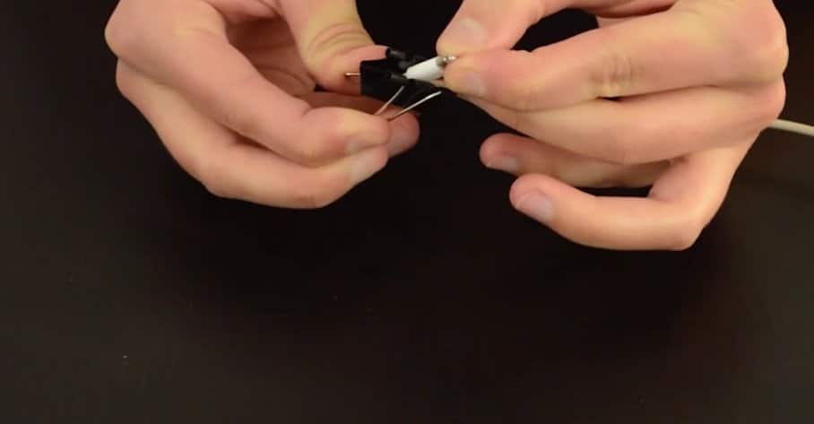Pincez l’extrémité des écouteurs et enroulez le fil autour. Finissez en coinçant la prise jack dans les parties métalliques de la pince.