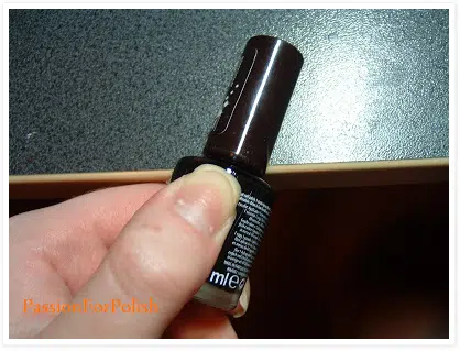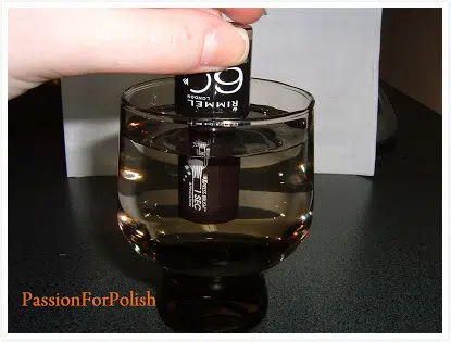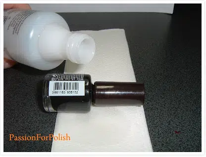 Ce qui empêche d’ouvrir le vernis, c’est le vernis séché qui s’accumule sur le système de vissage pour refermer le vernis (ou alors une absence totale de muscle dans les mains, et dans ce cas, vous n’y pouvez pas grand chose…). Et pour retirer le vernis, il n’y a rien de mieux que le dissolvant. Vous pouvez tremper le bouchon dedans ou passer un coton autour du bouchon. Comme sur l’image, vous pouvez aussi renverser du dissolvant sur le bouchon.