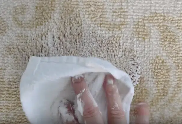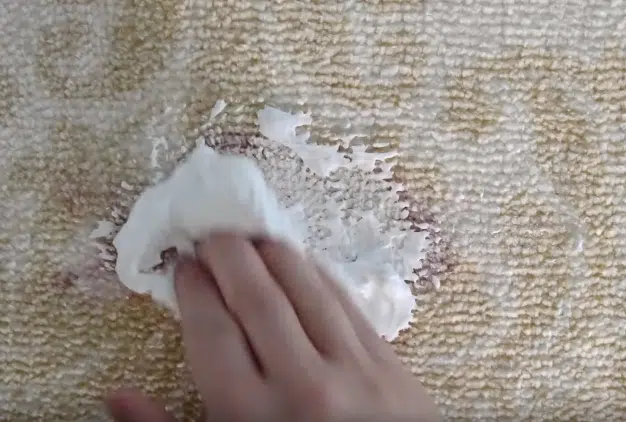 2) Versez ensuite un peu de mousse à raser dessus et imprégnez bien les fibres du tapis ou du tissu en malaxant un peu.