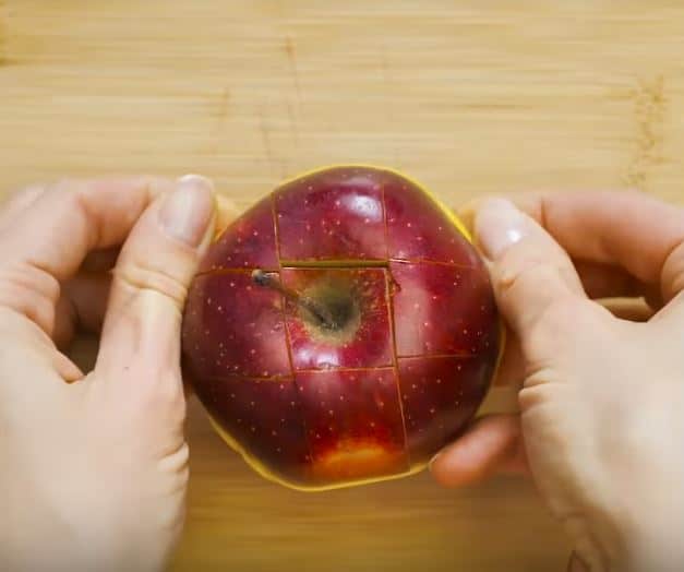 9) Coupez la pomme en quartiers et maintenez-la entière avec un élastique. Elle sera prête à consommer et pas noircie !