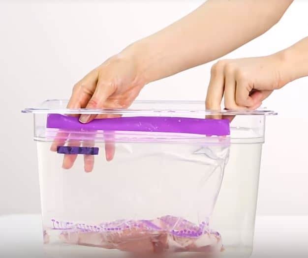 Placez l’aliment dans un sac congélation et retirez un maximum d’air. Fermez le zip presque entièrement puis immergez le sac dans l’eau froide. Il se comprimera (retirant ainsi tout l’air) et vous n’aurez plus qu’à le refermer complètement. Une fois surgelés de la sorte, vos aliments et notamment vos viandes et plats cuisinés se garderont bien mieux au congélateur.