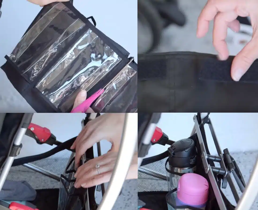 2) Découpez un porte-chaussures et mettez-y des bandes velcro. Accrochez le tout à la poussette pour y glisser les biberons ?