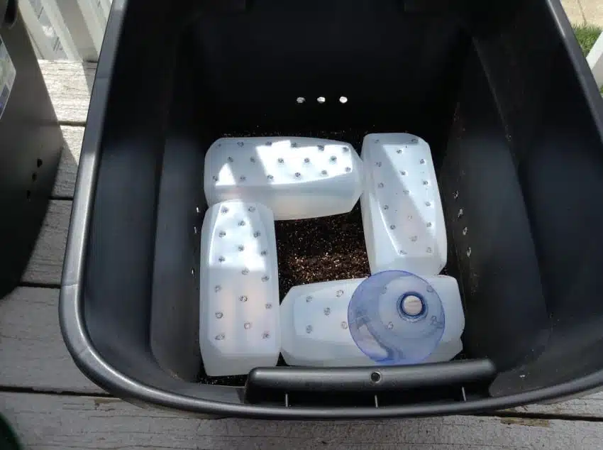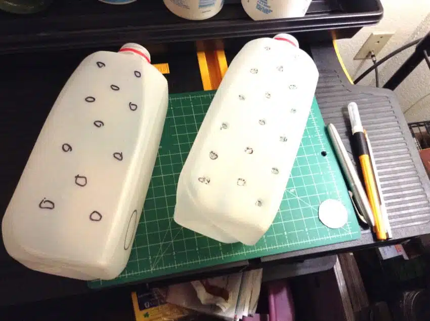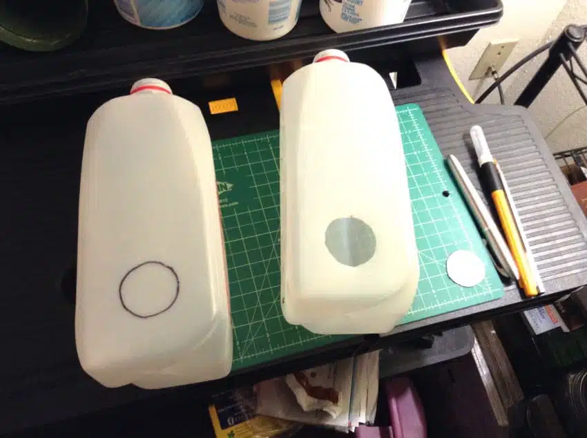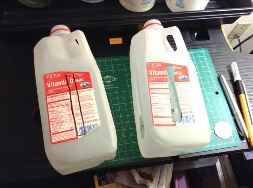 5) Une des bouteilles de lait servira de point d’entrée pour l’eau. Il faut donc y créer un trou assez grand pour laisser passer la bouteille d’eau.