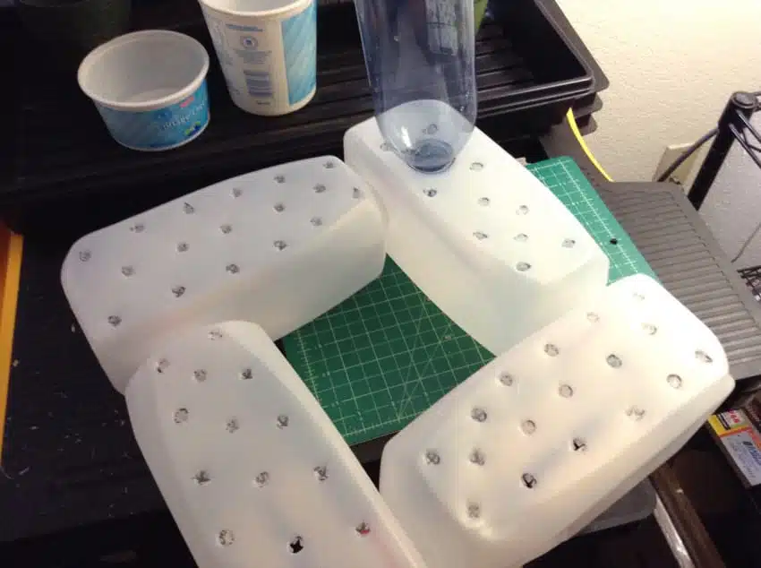 2) Dans une face à côté, elle fait de plus gros trous (assez gros pour laisser passer le goulot d’une autre bouteille de lait mais pas trop non plus.