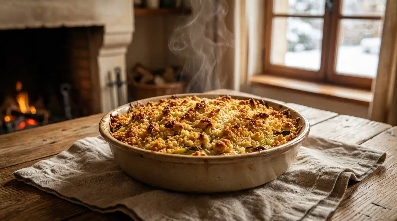 L’hiver appelle irrémédiablement des plats réconfortants, riches en saveurs et capables de réchauffer immédiatement les cœurs autour d’une grande tablée familiale. Alors que le mois de février bat son plein, les légumes de saison comme le poireau offrent une douceur incomparable, idéale pour contrebalancer le froid mordant de l’extérieur. Imaginez un plat qui associe le fondant absolu d’une fondue de légumes mijotée avec amour et le croquant irrésistible d’une couverture dorée au fromage italien. C’est toute la promesse de ce crumble salé, une véritable ode à la gourmandise qui transforme un simple repas du quotidien en un moment de partage inoubliable. Loin des classiques sucrés aux fruits, cette version salée joue habilement sur les textures : le crémeux des poireaux compotés se marie divinement avec le caractère salin et umami du parmesan. Facile à réaliser, économique et terriblement satisfaisant, ce gratin revisité aux accents rustiques s’impose comme la star incontestée des dîners conviviaux.