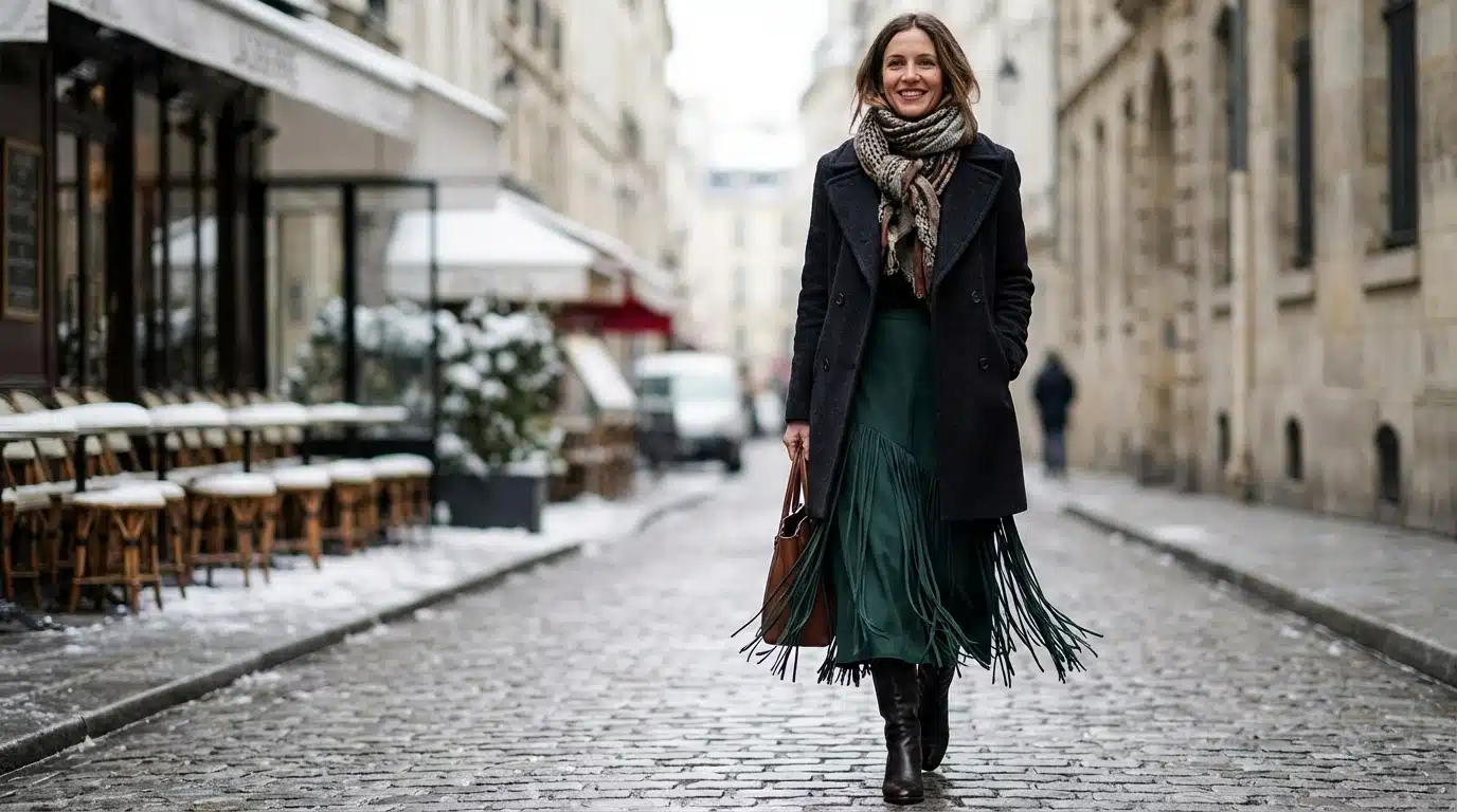 Cette nouvelle silhouette allongée rompt définitivement avec le style adolescent d’autrefois. En février 2026, la femme qui adopte cette pièce cherche la distinction, non le déguisement. Les tissus fluides remplacent le daim cartonné, permettant au vêtement d’épouser les hanches sans les contraindre. C’est cette fluidité, couplée à une longueur généreuse, qui gomme le côté gadget pour ne garder que l’aspect couture. Les lignes verticales dessinées par les franges créent un effet d’optique qui allonge la jambe avec flatterie.
