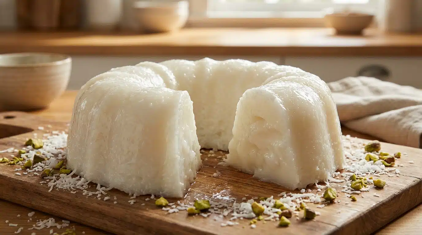 Imaginez une fin de repas d’hiver, alors que le vent souffle au-dehors et que les convives sont rassasiés par un dîner généreux. C’est à cet instant précis qu’arrive sur la table une douceur immaculée, tremblotante et brillante, promettant une fraîcheur inattendue. Ce gâteau blanc, d’une simplicité visuelle déconcertante, réveille instantanément la gourmandise sans alourdir l’estomac. Il n’évoque pas les pâtisseries classiques riches en beurre, mais invite au voyage grâce à son parfum exotique envoûtant. Nul besoin de farine, d’œufs ou de produits laitiers pour obtenir cette texture fondante qui rappelle le traditionnel blanc-manger antillais ou le haupia hawaïen. C’est le dessert idéal pour clore un banquet de février avec une touche d’élégance minimaliste. Laissez-vous séduire par la promesse d’un nuage végétal qui fond délicatement en bouche, offrant une expérience gustative pure et réconfortante.