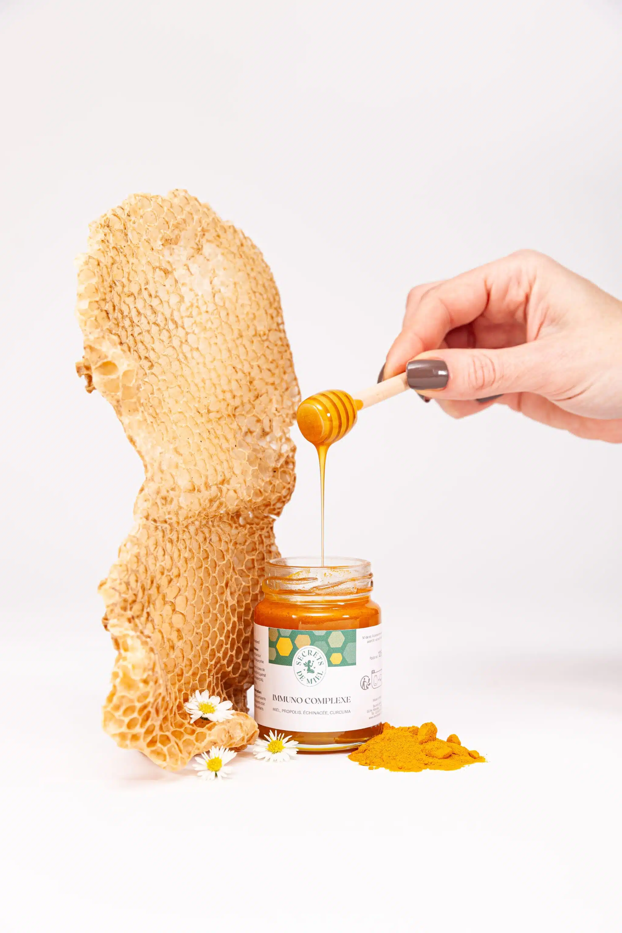 Né de la rencontre entre le savoir ancestral et la puissance des actifs naturels, le Miel Immuno’Complexe est bien plus qu’un simple miel. Véritable bouclier saisonnier, il marie la douceur du nectar à la force combinée de la propolis, du curcuma et de l’échinacée. Ensemble, ces trésors de la nature renforcent les défenses, apaisent les irritations et aident l’organisme à mieux faire face aux agressions du quotidien.