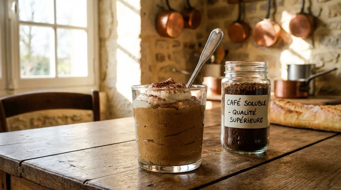 La base de cette mousse se compose de trois ingrédients clés qui, une fois réunis, créent une alchimie parfaite. Contrairement à ce que l’on pourrait croire en privilégiant systématiquement le café moulu d’origine, le secret d’une mousse au café rapide réside dans l’utilisation du café instantané. Celui-ci garantit une dissolution immédiate sans ajout d’eau, ce qui préserve la fermeté de la crème. Prévoyez les quantités suivantes pour régaler vos invités :