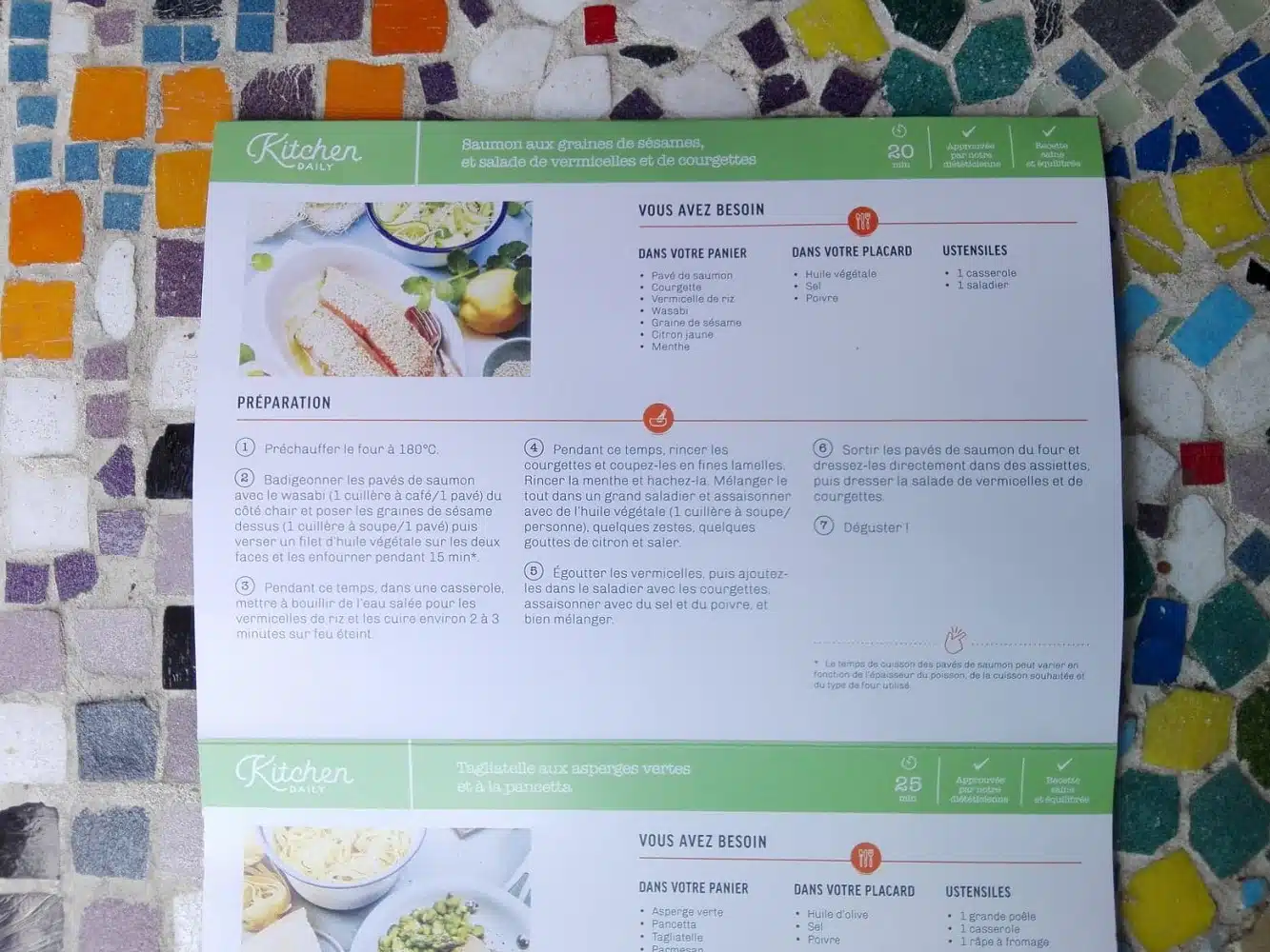 Ce qu’on a beaucoup aimé, c’est la recette de saumon accompagné de courgette, vermicelle de riz et citron, wasabi et sésame. Mais aussi la recette de quesadillas au poulet, guacamole et cheddar. Les épices de paprika et de cumin étaient vraiment délicieuses et leur odeur nous a fait voyager ! (J’aimerais bien retrouver les mêmes…)