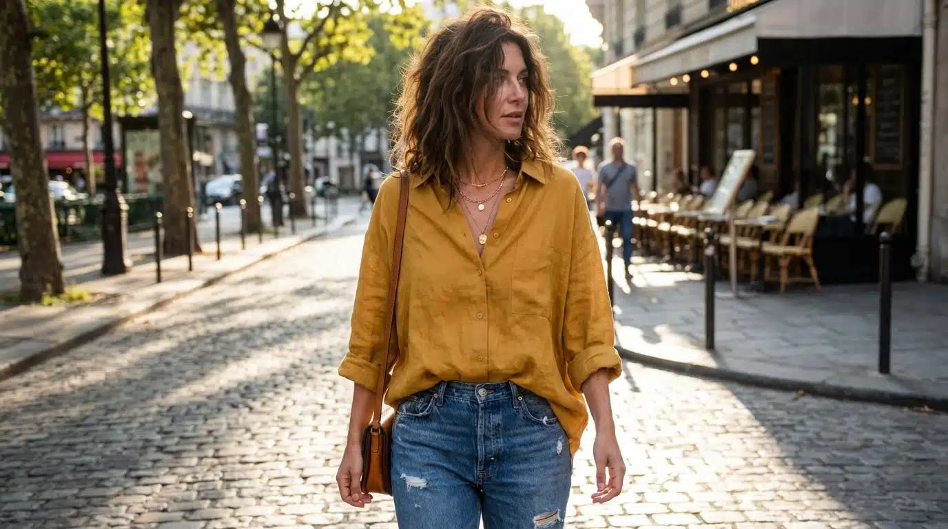 Si la chemise oversize fait le travail, c’est avec un jean qu’elle révèle tout son potentiel mode. La recette est infaillible : le lin naturel et aérien heurte la solidité du tissu américain. Cette chemise portée sur un jean vintage crée un décalage urbain terriblement efficace. Le look perd instantanément toute idée de ringardise.