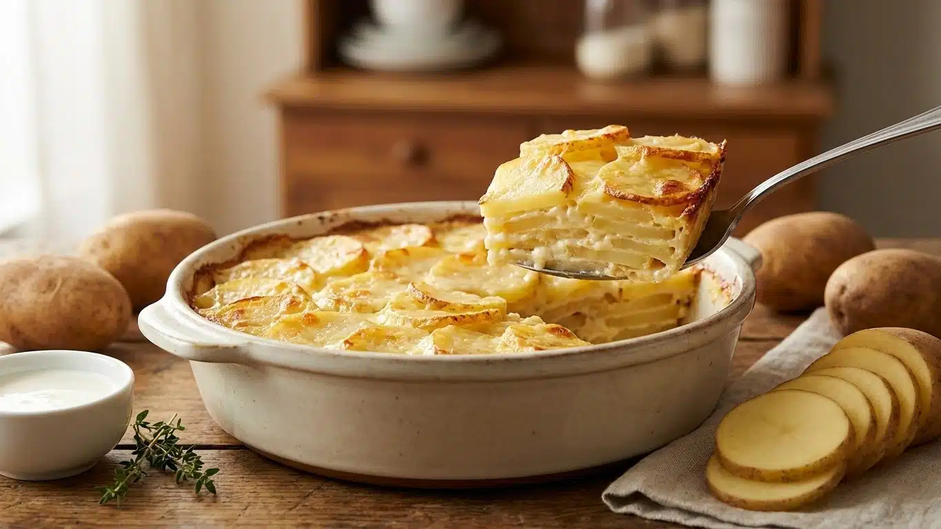 Préparer à l’avance, oui, mais pas n’importe comment. Les pommes de terre crues tranchées s’oxydent, et elles peuvent relâcher de l’eau en attendant, ce qui dilue la sauce. La méthode la plus sûre pour le batch cooking : cuire le gratin, le refroidir rapidement, puis le réchauffer au four. La texture se tient mieux et les saveurs se posent.